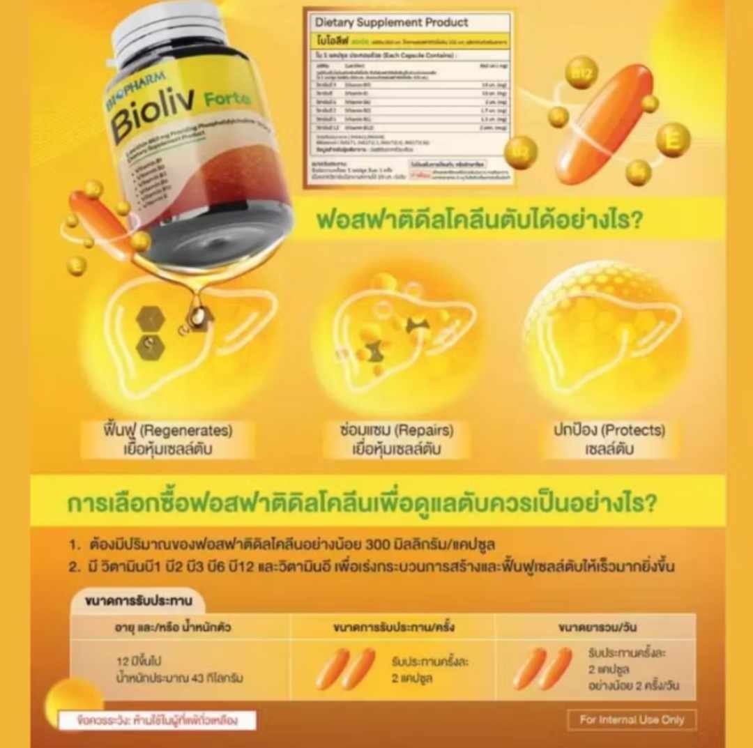 Bioliv forte contains 300mg of essential phospholipids (EPLs), naturally derived from soybeans. It serves as nutritional support for liver caused by chronic liver diseases, liver cirrhosis, fatty liver, and exposure to hepatotoxic substances.
