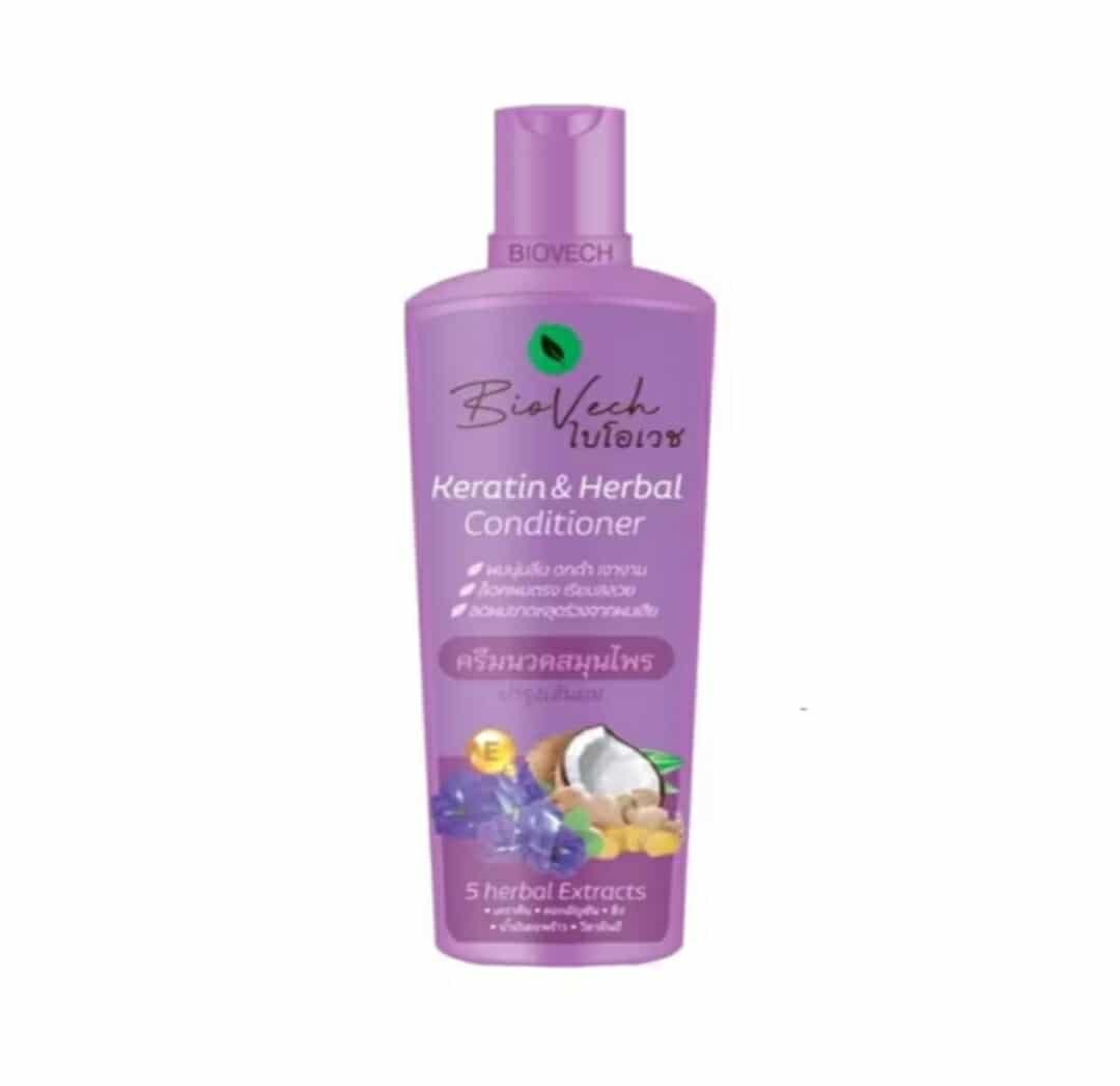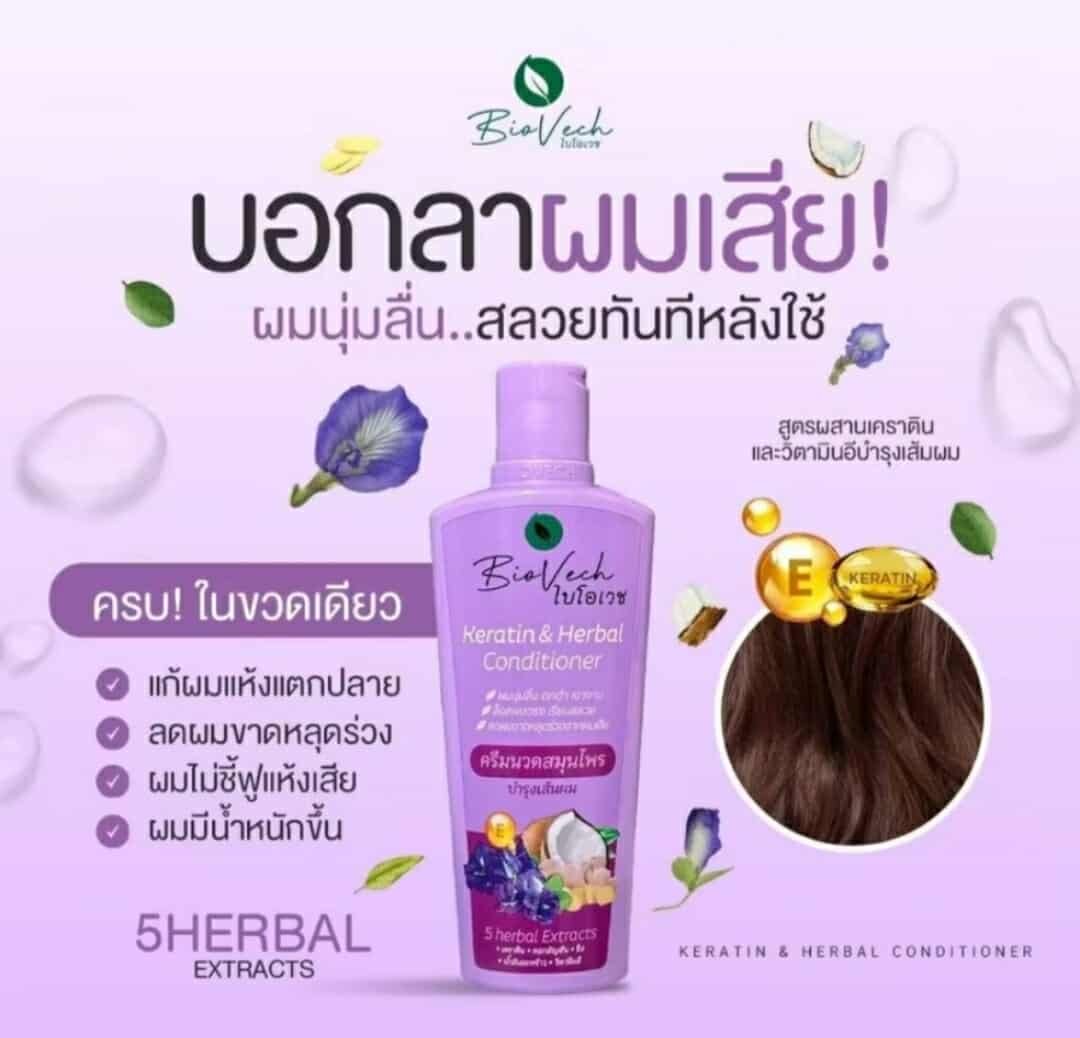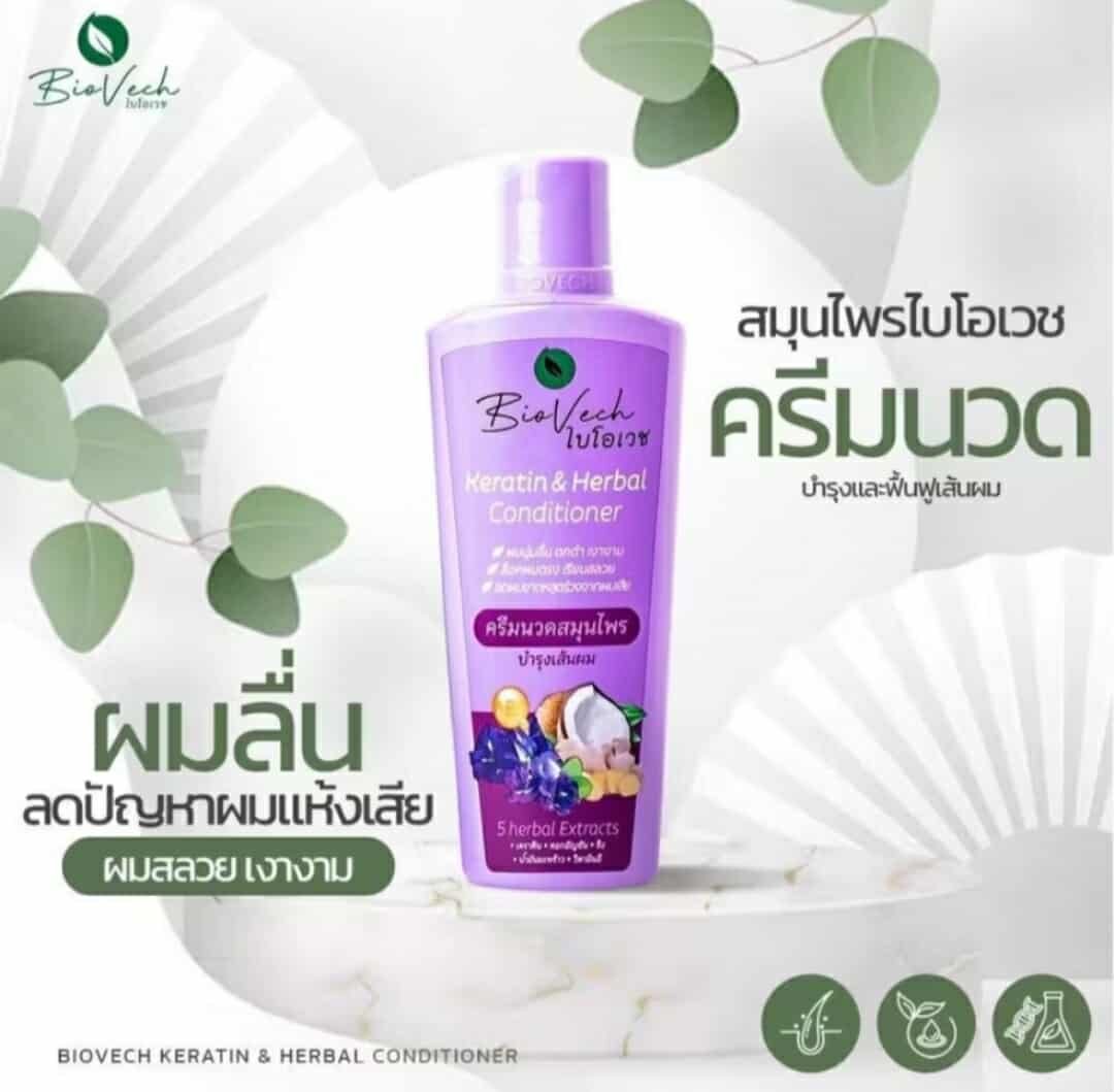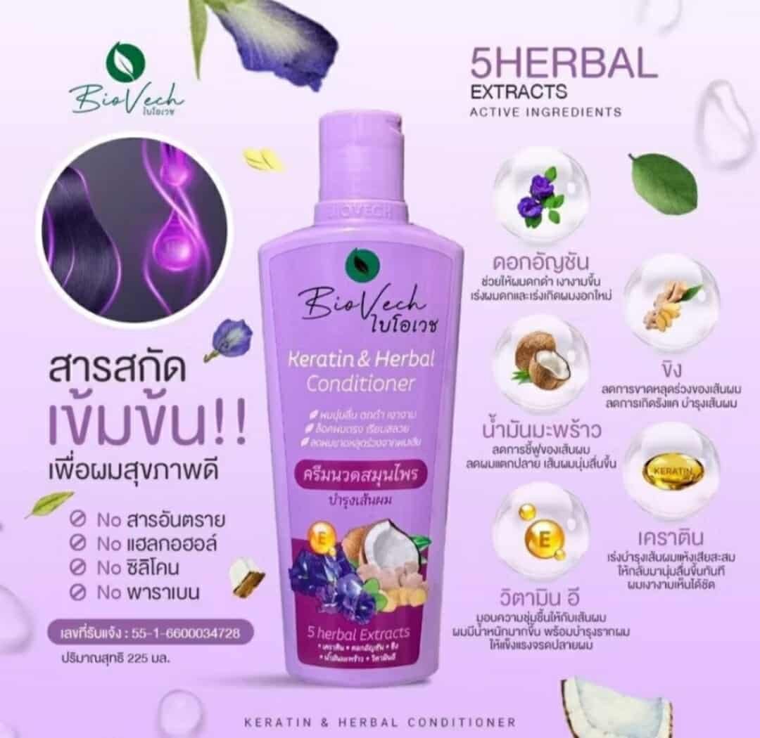 Hair loss conditioner Biovech is a hair care brand specializing in herbal conditioners. These products are formulated with seven fresh herbs, specifically to reduce hair loss, promote hair growth, strengthen hair roots, and stimulate new hair growth. These products contain key ingredients such as kaffir lime, butterfly pea flowers, ginger, miang leaves, senna leaves, yanna leaves, and senna leaf. These ingredients address thinning, damaged hair, and dandruff.