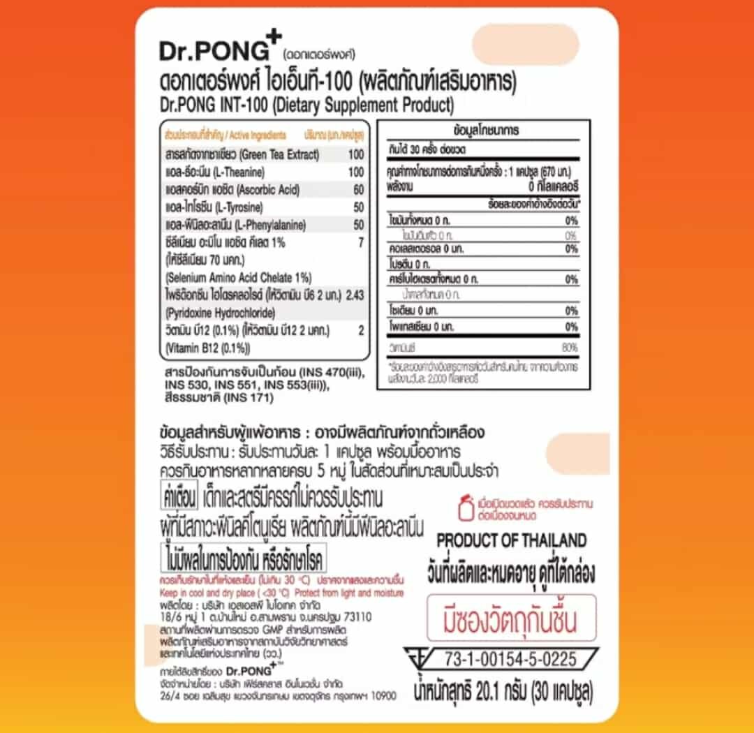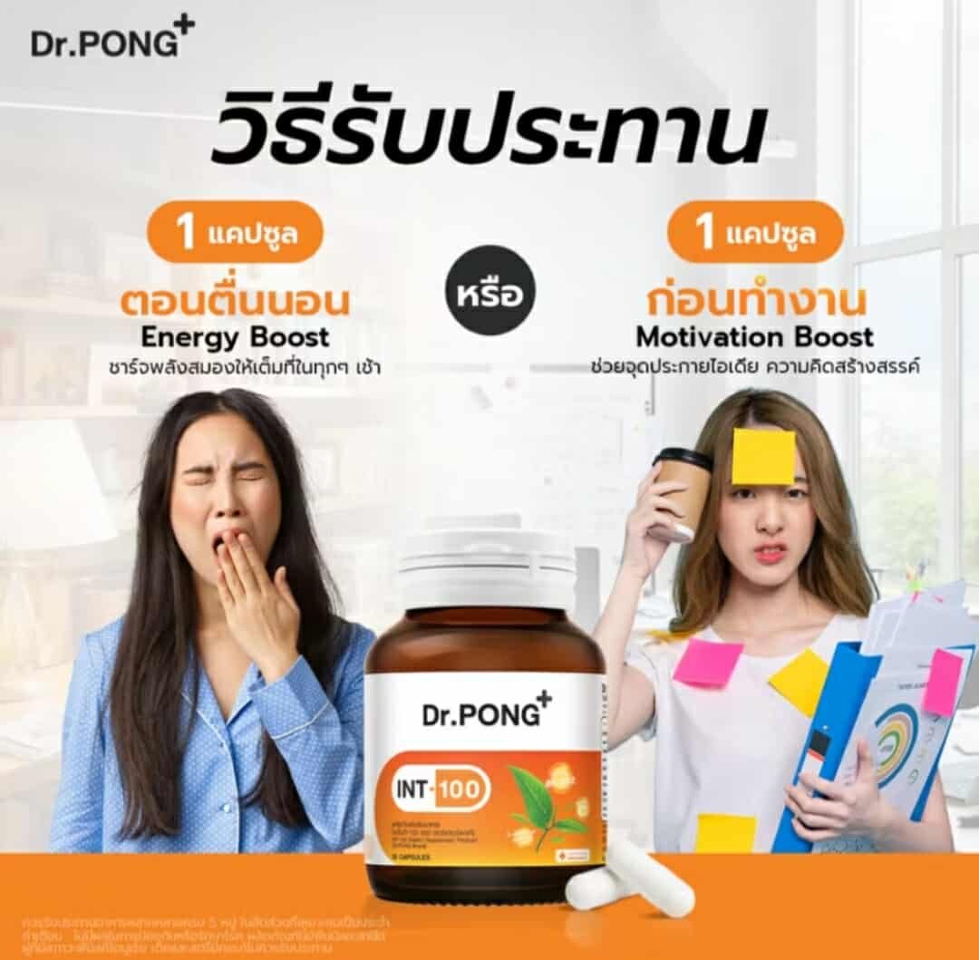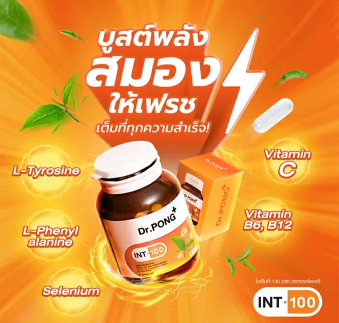 Brain vitamins  Dr. Pong INT-100 nourishes the brain, increases alertness, and reduces fatigue. Its key ingredients include green tea extract, L-Theanine, Vitamin B6, Vitamin B12, and L-Tyrosine, which work together to enhance concentration and memory. It’s ideal for working and school-age individuals who want to enhance their brain and body’s performance.