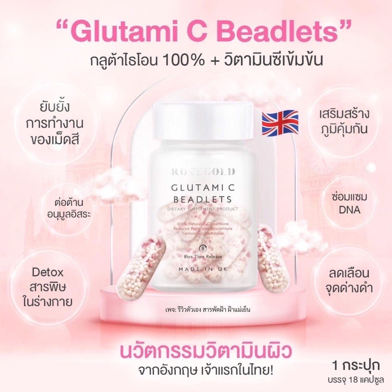 Gluta extract from Japan Technology from England 100% NATURAL GLUTATHIONE from Japan uses a fermentation process. (FERMENTATION) with microorganisms Specially selected breeds Exclusive copyright -BEADLETS technology from England divided into 3 forms of acion