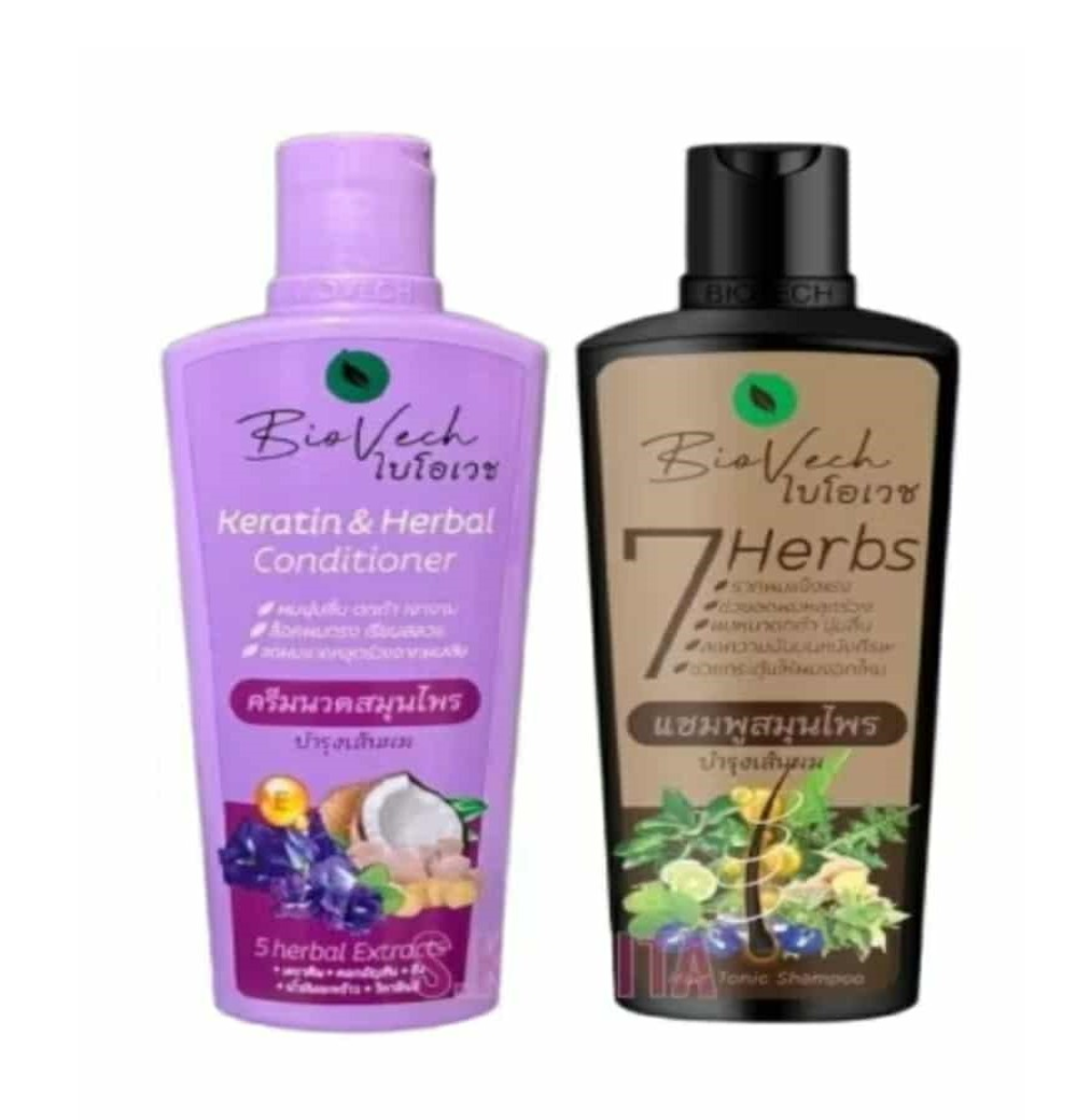 Product details: Biovech Seven Herbs Hair Tonic Shampoo promotes hair growth, prevents hair loss, and nourishes hair. It repairs fine, brittle, and split ends, resulting in thick, dark hair. It reduces graying, moisturizes the scalp, and reduces dandruff.