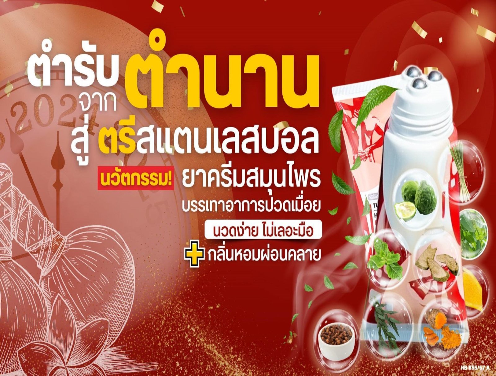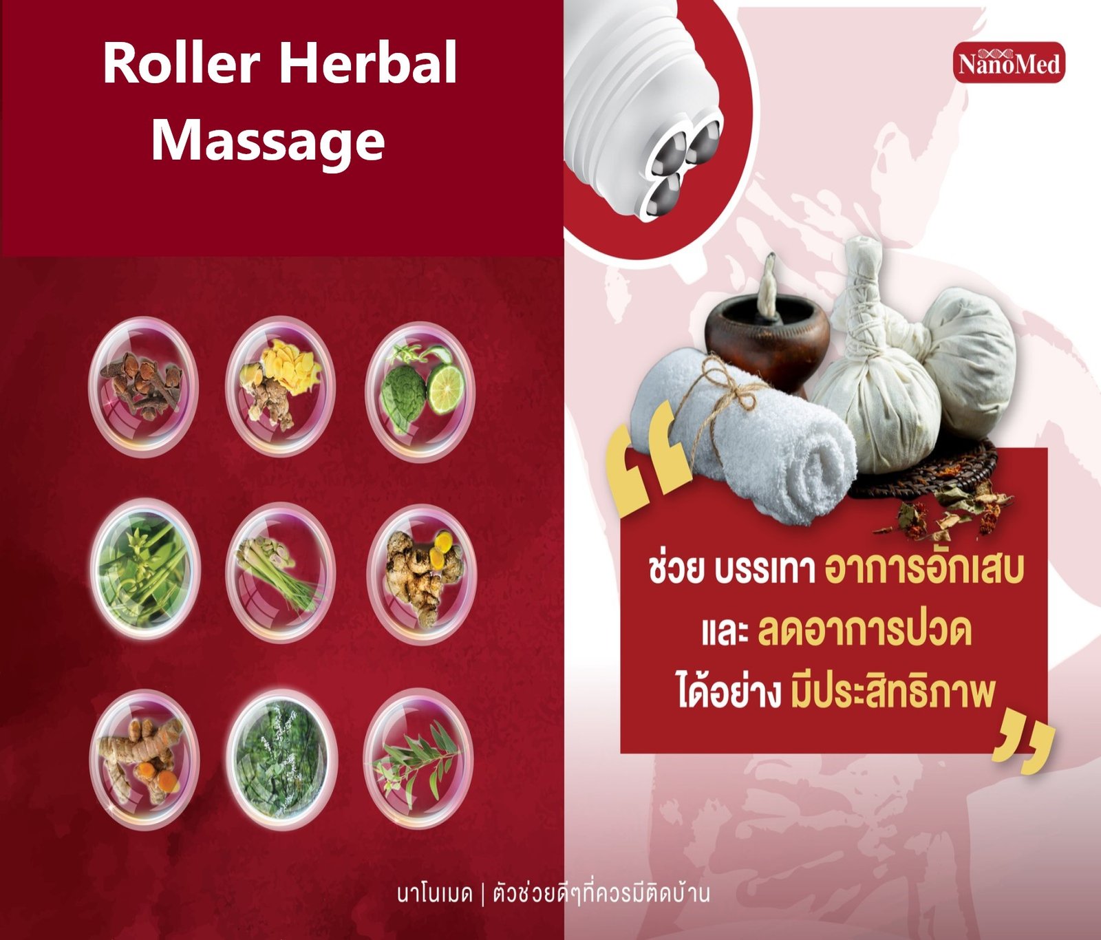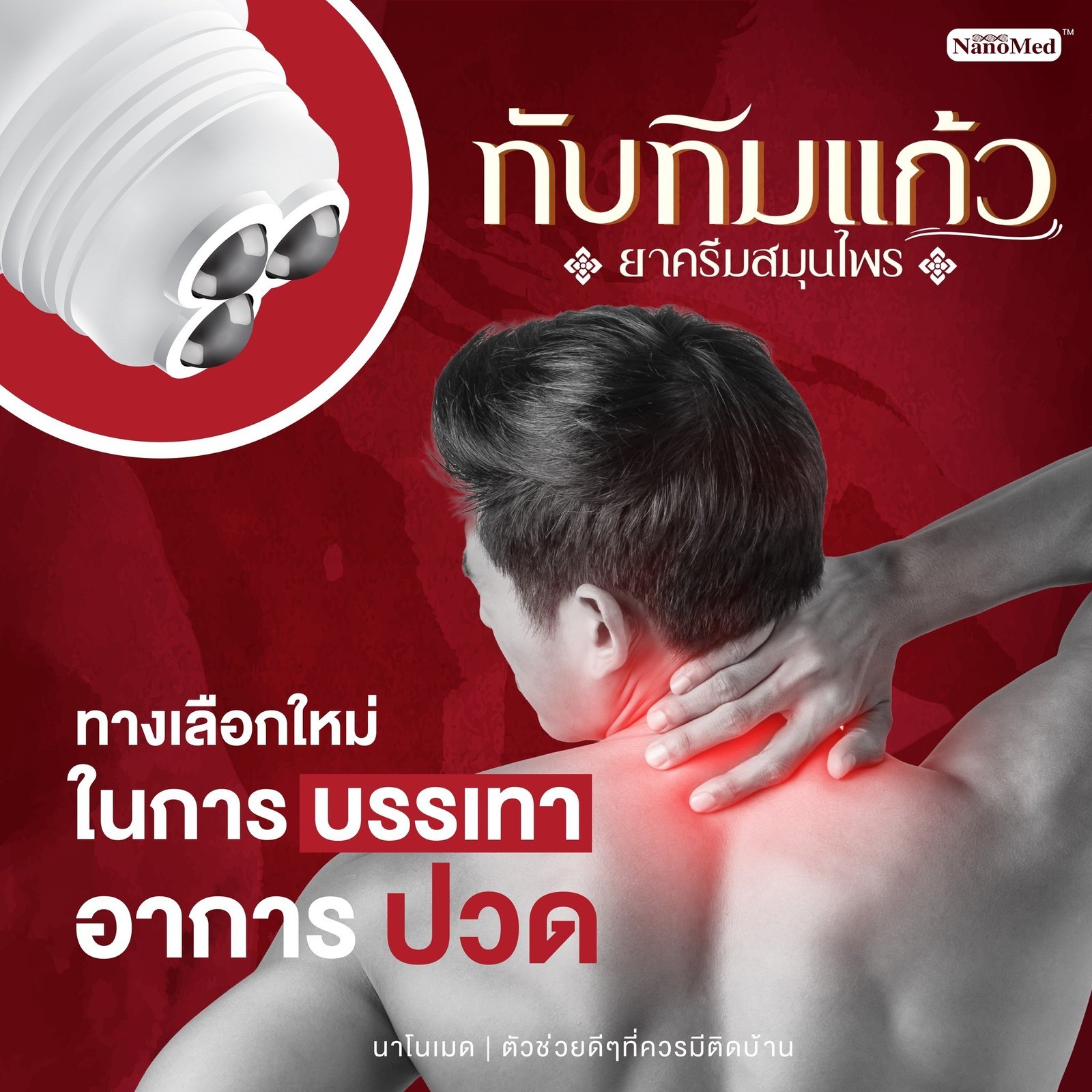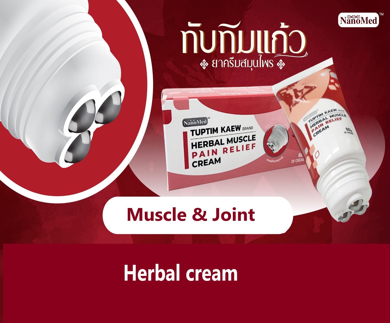 – Pain-relieving cream with a rolling ball head which smoothly spreads the soothing herbal extracts from the Thai herbal compress recipes. More than 9 kinds of herbs, comes together to form a relaxing herbal cream.